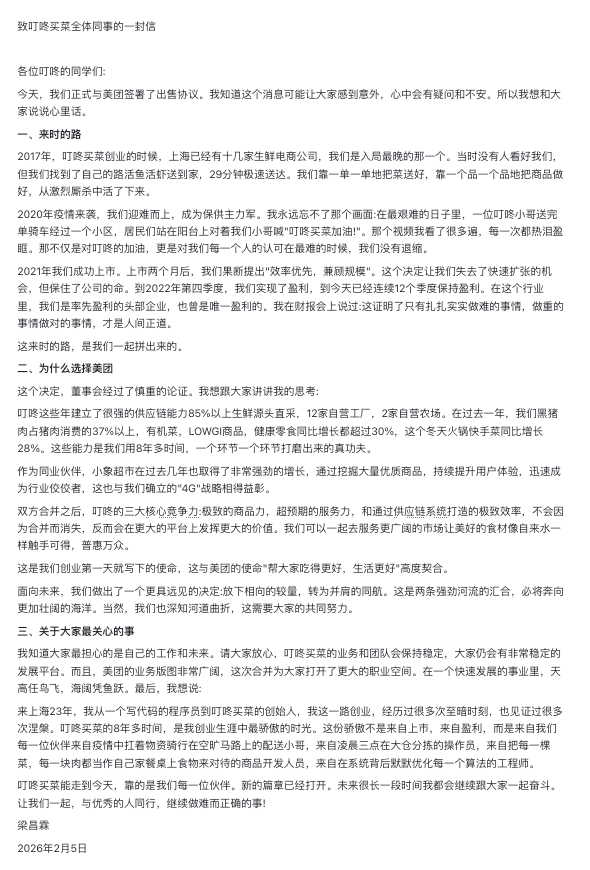 为什么是现在?为什么是美团?梁昌霖在2月5日发给全体员工的内部信中,给出一部分答案。